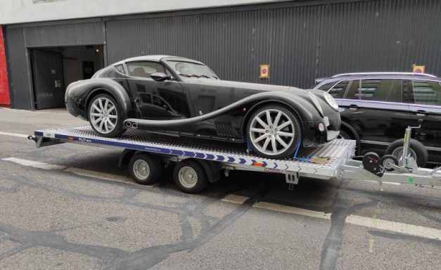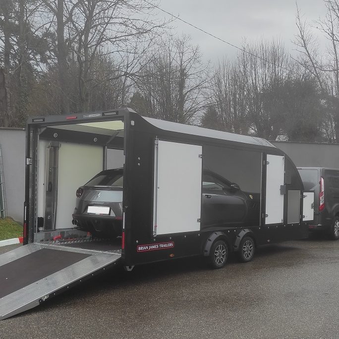 Livraison, récupération de votre véhicule partout en France sur une remorque plateau fermé et discrète "Brian & James", tracté par un véhicule utilitaire Ford Transit.