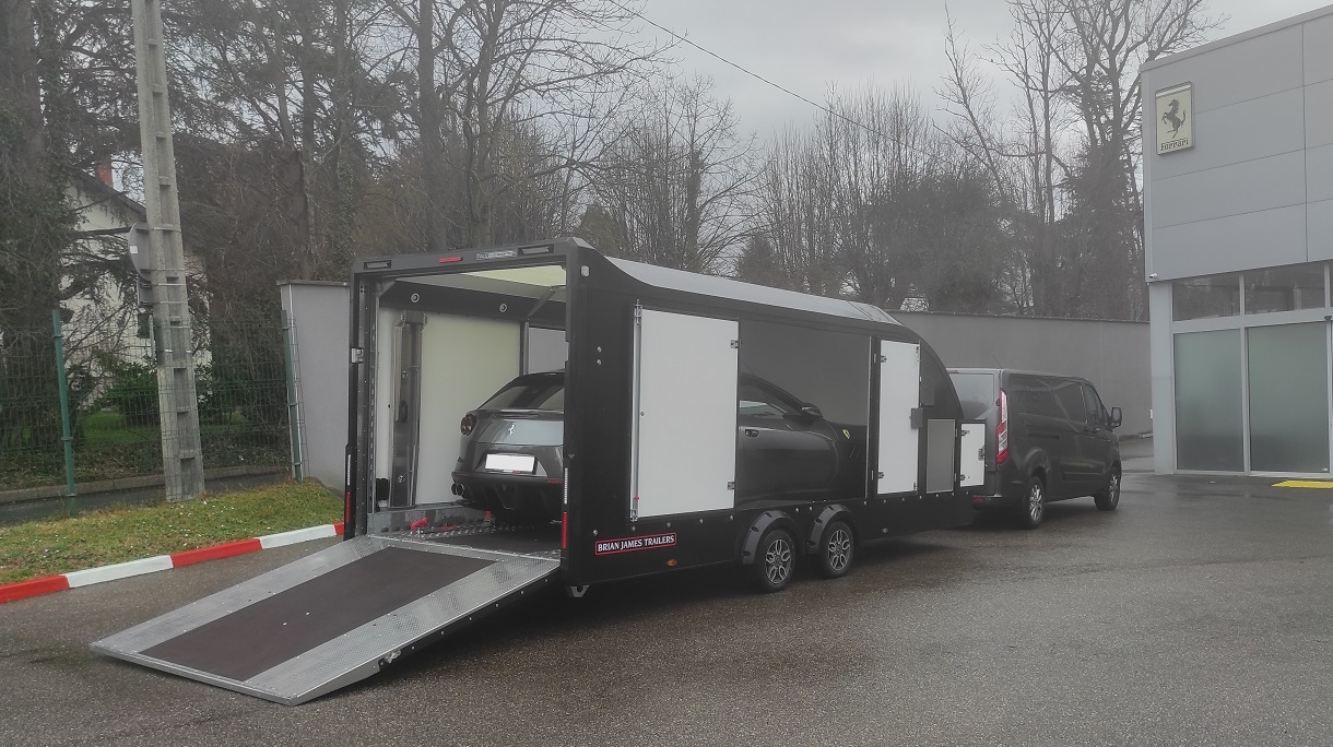 Livraison, récupération de votre véhicule partout en France sur une remorque plateau fermé et discrète "Brian & James", tracté par un véhicule utilitaire Ford Transit.
